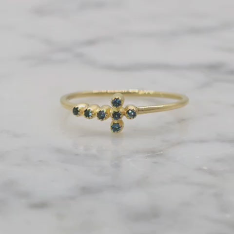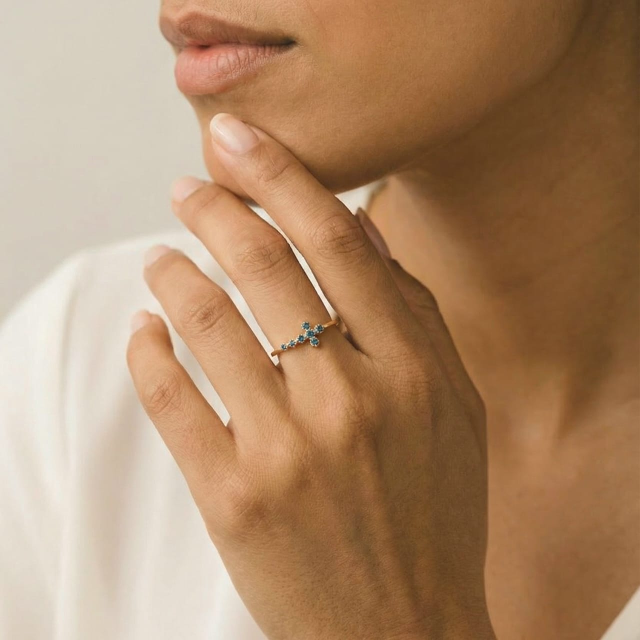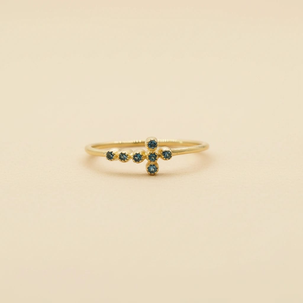Este anillo está elaborado en oro amarillo de 18 quilates y presenta siete topacios London Blue, cuidadosamente engastados para formar una cruz sutil y armoniosa.