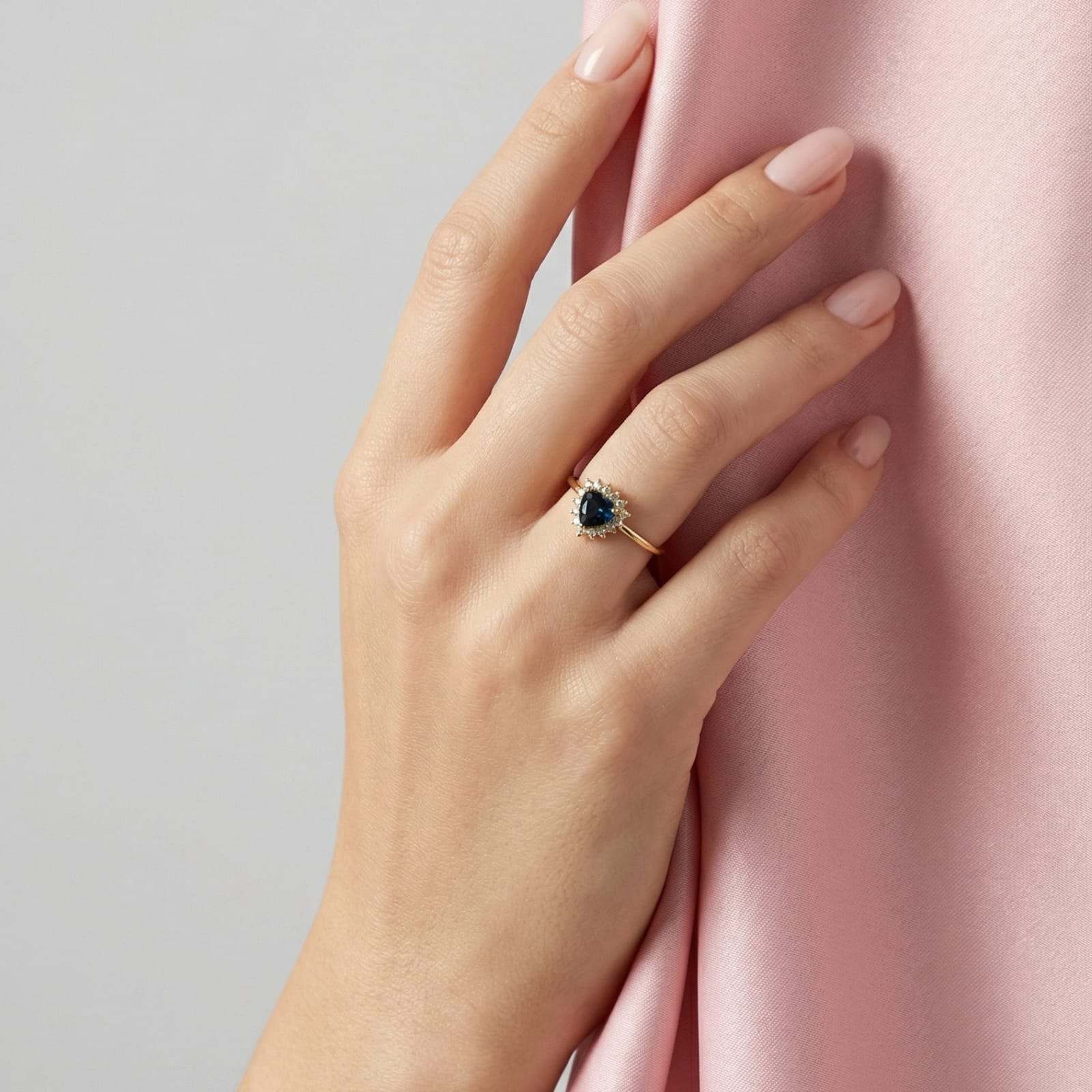 Un fino halo de zircones rodea la piedra central, aportando luminosidad y realzando su presencia sin perder la sutileza del diseño.