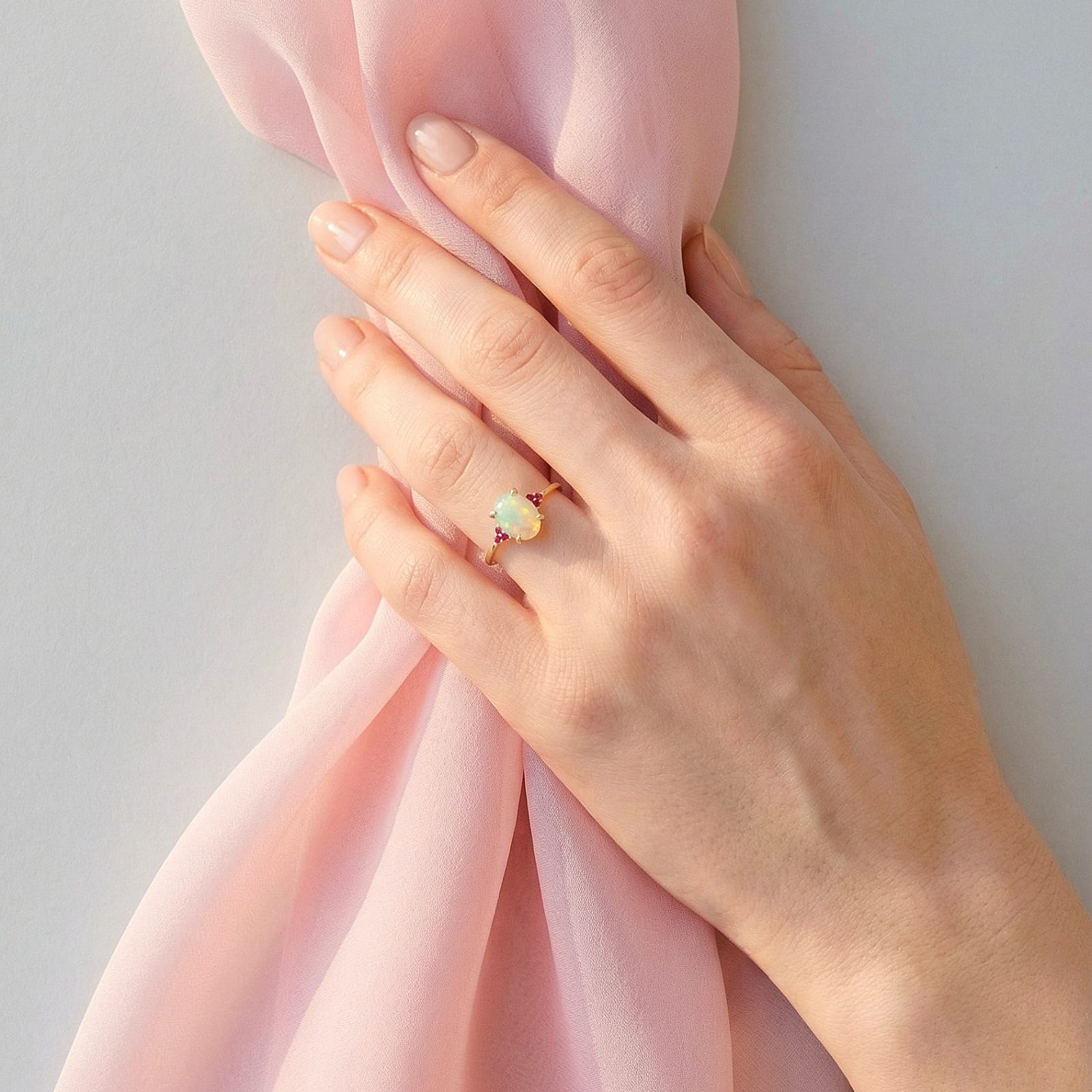 El ópalo central, de suaves destellos iridiscentes, es el corazón de este anillo elaborado en oro amarillo de 18 quilates. Su forma oval aporta equilibrio y elegancia, mientras que los rubíes laterales añaden un acento de color profundo que enmarca la piedra principal con carácter y sofisticación.