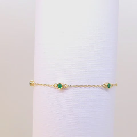 Pulsera elegante elaborada en oro amarillo de 18 quilates, diseñada con cinco esmeraldas biseladas que crean un equilibrio perfecto entre color y luminosidad.